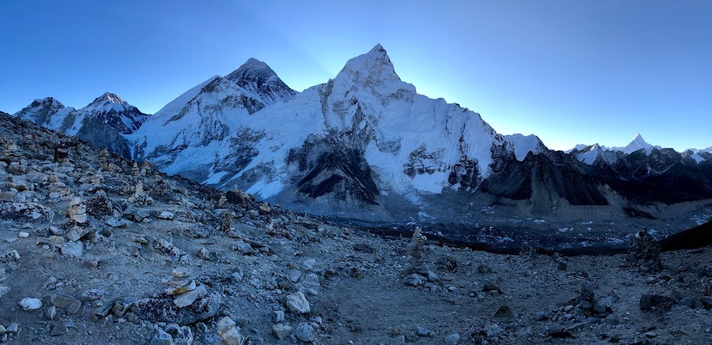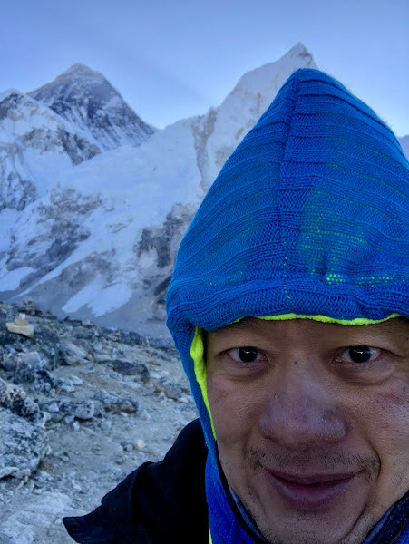Straight ahead of us, Everest peak stood in its full grandiose, still bluish from the darkness of the morning. The sun was beginning to rise above the peak, but the warm golden rays hadn't hit Everest yet. Was it beautiful seeing Everest from the top of Kala Patthar? In hindsight, it was kind of an anti-climax, I felt. We only managed to see its peak. But that was it. For bragging rights, some would say. For us, it was more for the 5545m.