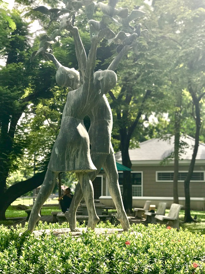 The sun, high up in the mid-morning sky beat down. Young Thai men and women run round in an anti-clockwise direction round the lake in the middle. An old style chime clock tower and a Chinese-style pavilion marked the park. Several lovely sculptures dotted as landmarks. We were impressed to see cyclists, both locals and farangs taking onto the cycling paths going in circles. Beside the lake, small groups of old folks in long pants and cotton shirts arranged themselves in rows doing Taiji. Immersed totally in their Chinese newspapers were other old men, obviously of Chinese descent, seated on the many benches amongst the landscaped grass. I was happy to see farangs enjoying their runs side by side with the locals. One round the park on the designated asphalt running path was around 1.7km.