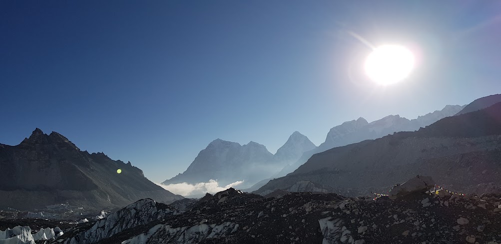My eyes almost never lifted off from the ground as rocks after rocks appeared in haphazard fashion, threatening to trip my trailing foot should I be just so careless to lift it a little less high. A few steps. And another long pause to catch my breath. Peering in front, the ridge led straight to Everest Base Camp. We were not far, but time was running out for us.