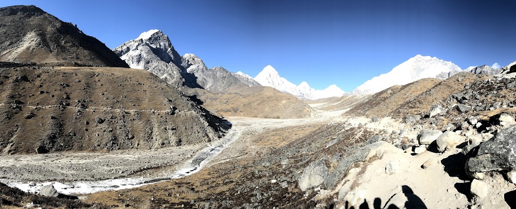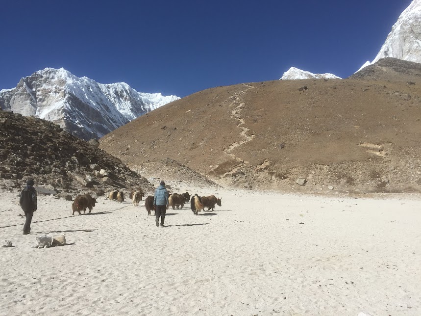 The flat plain right after the Gorak Shep guesthouse Himalayan Lodge was a temporary respite for the rocky climbs. We shared this plain with a herd of yaks on our way outwards.