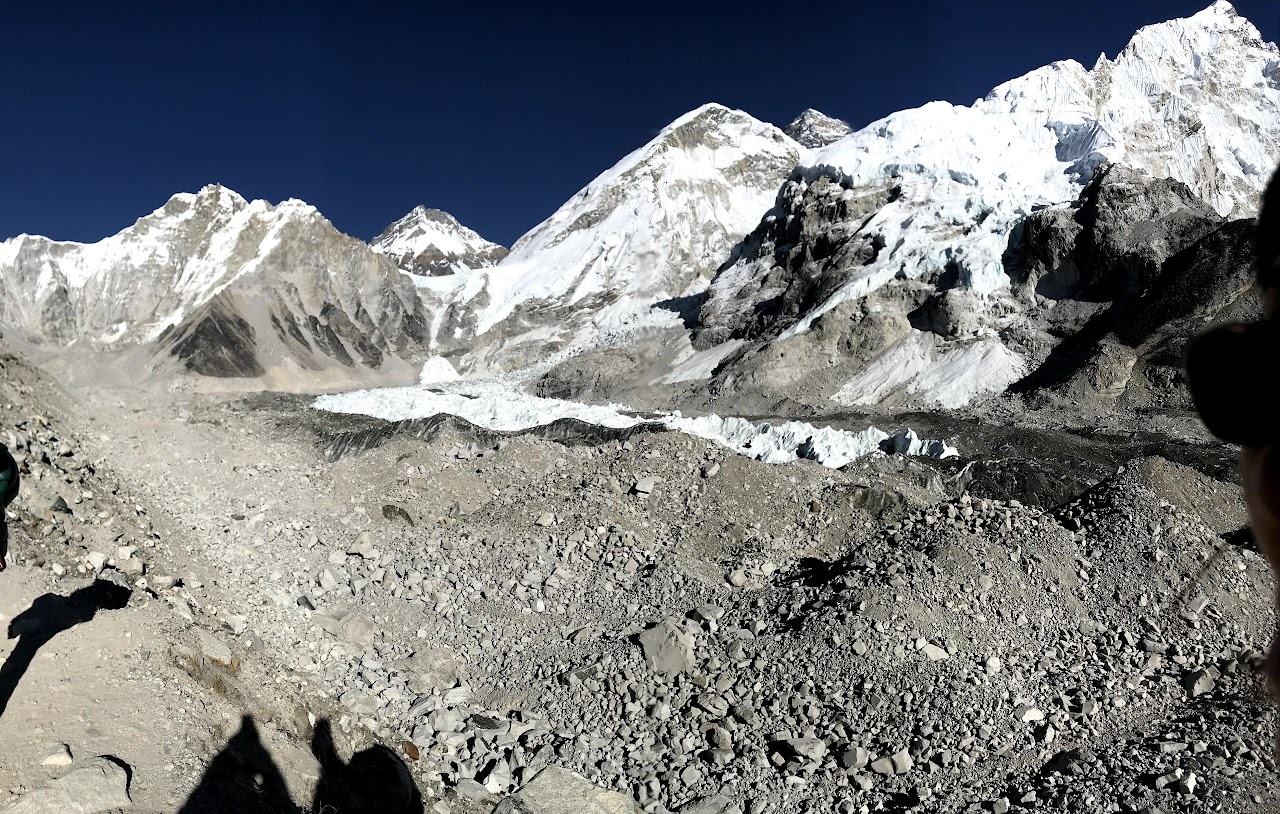 | Panorama by Alex - Pumori peak on the left with the black Kala Patthar just below it. |