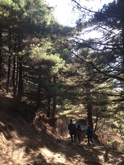 The climb up towards Monjo was still exhausting and breathless. It could not be otherwise because it was a steep ascent. But today's climb felt shorter, and our steps felt slightly lighter. It had all to do with the heart lah. Our hearts were all in a calm mode, and our senses were all primed to soak in the sight, the breeze, the whole atmosphere. None of us were in much of a hurry. Cheng Cheng was particularly relaxed. I could always tell from behind it was her, not only from her pinkish outer shell, but also because of her gentle gait that was so suitable for trekking.